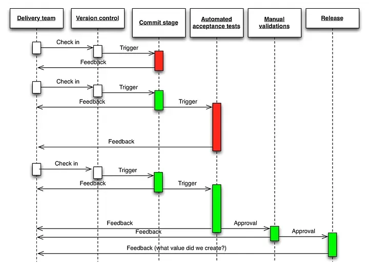 Every change committed to source control triggers the creation of a new instance of the pipeline. We call this a release candidate. If the release candidate passes all the tests, it can be released.